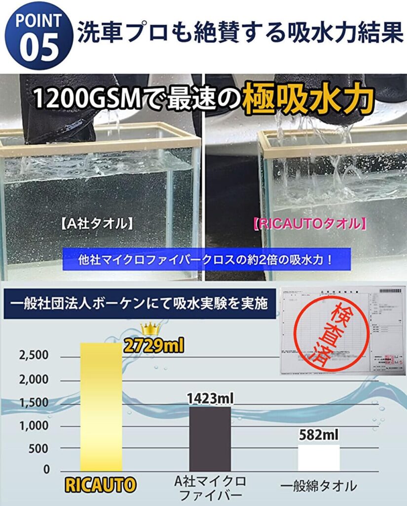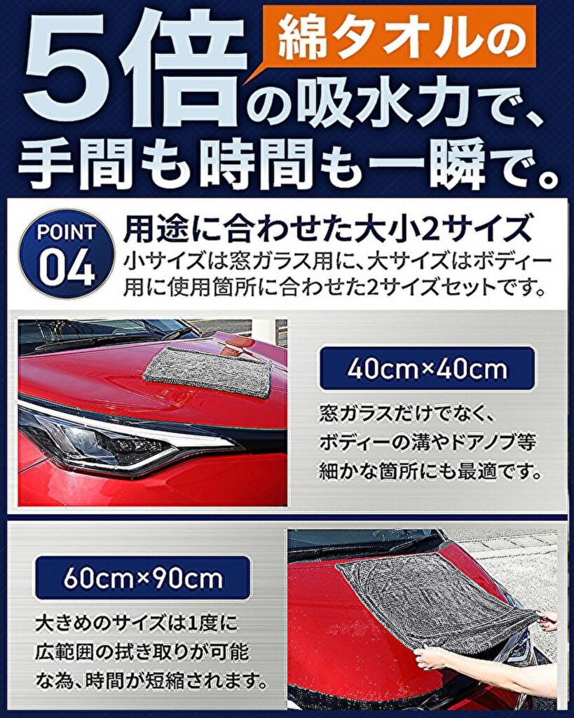 - 特徴: 一般的マイクロファイバー(片面)より2倍の吸水性が優れており、洗車時間を半分まで短縮できます。