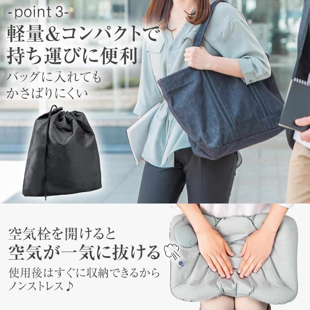- 特徴: 手動ポンプで自分好みの硬さに調整可能。コンパクトになるので旅行や機内持ち込みにも便利。