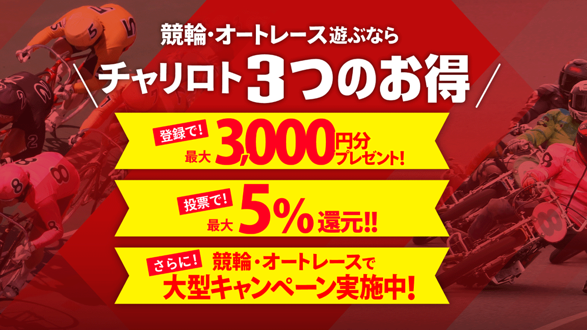 【チャリロト.com】は、競輪(KEIRIN・ケイリン)やオートレースの車券を簡単に購入できるオンラインサービスです。全国の競輪場やオートレース場で開催されるレースに、いつでもどこでも参加可能です。