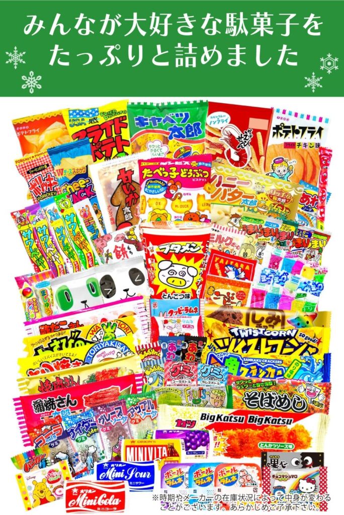 昔懐かしの駄菓子が60種詰め合わせ!今年のクリスマスは子供と一緒に懐かしいお菓子を選ぶのもありかもしれません。